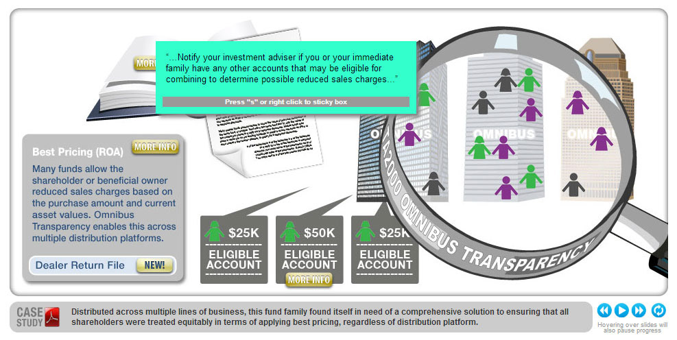 Overview: An "Interactive Overview" utilizing a number of technologies to convey the benefits of the Omnibus Transparency financial product. The interactive slideshow required the support of both legacy Internet Explorer 7 browsers and Apple mobile devices (iOS). These requirements necessitated the avoidance of Adobe Flash as a foundation and required integration of sophisticated Javascript and very limited use of HTML5 and CSS3.